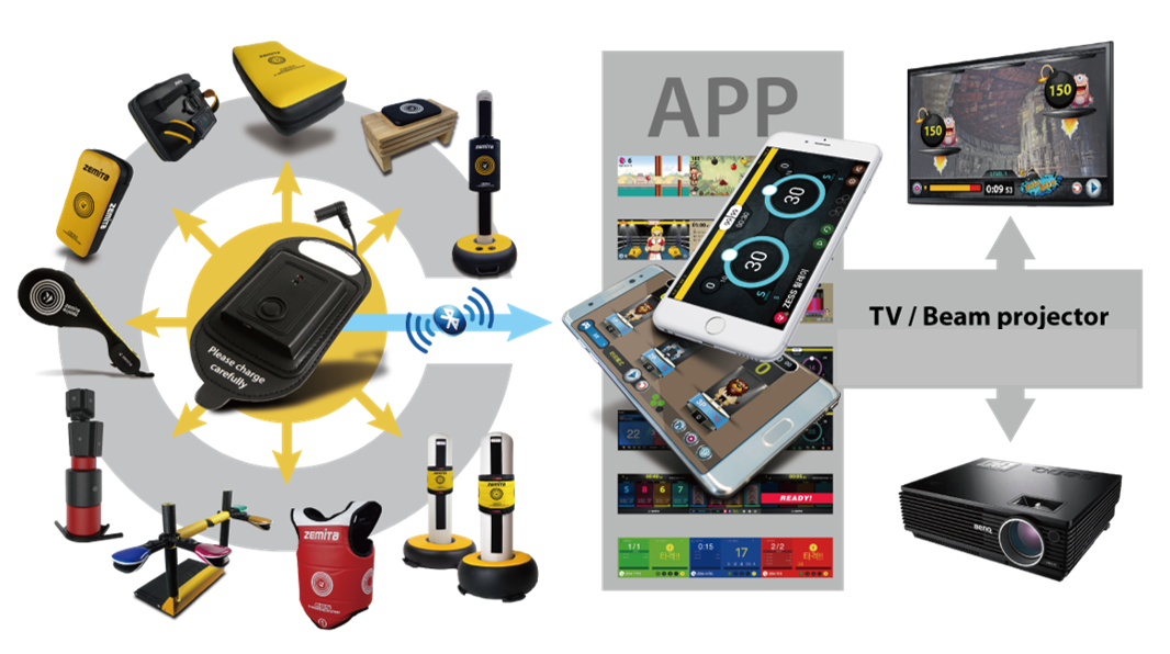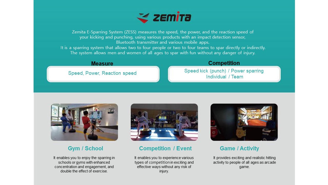 Zemita E-Sparring System (ZESS) measures the speed, the power, and the reaction speed of your kicking and punching, using various products with an impact detection sensor, Bluetooth transmitter and various mobile apps.